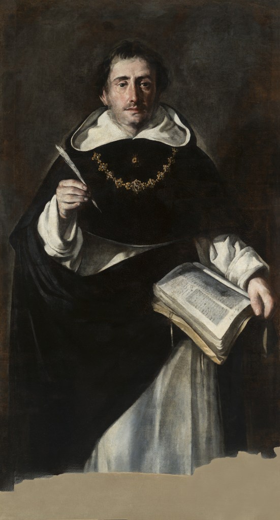 Thomas was born in Roccasecca, near Aquino, controlled then by the Kingdom of Sicily, and in this portrayal of the saint by Antonio del Castillo y Saavedra (1616 – 1668) Thomas stands with his pen raised as if he is ready to write, perhaps his famous ‘Summa’ – judging by the size of the large book at his side. As if to emphasise Dominican balance between study and contemplation Thomas appears to have paused his intellectual activity as if he is waiting to receive divine illumination.