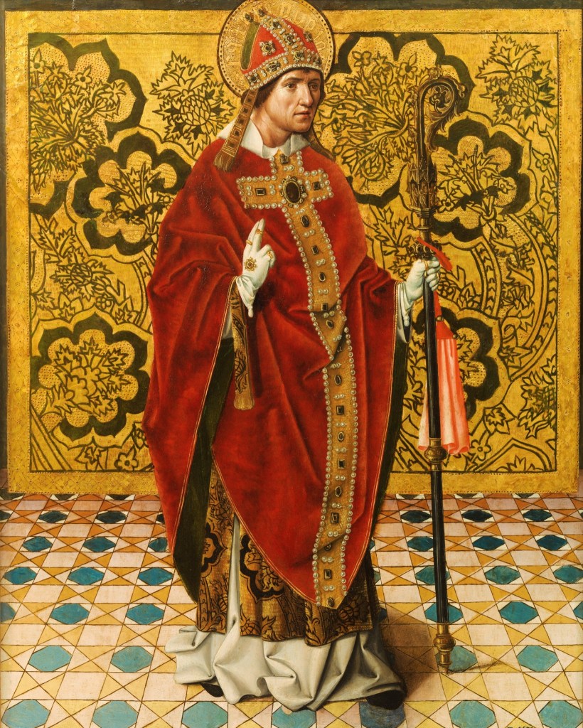 This image of Gregory was painted around 1500 by the Riojan artist Juan de Nalda (active 1490-1510). Juan completed his artistic formation with Jean Changenet in Avignon. When he returned to Castile he worked mainly in Palencia and Burgos. The simplification of volumes in his work and the importance given to light show the influence of Provencal art. Notice also the striking contrast between the design of the pavement and the decorative gold sgraffito background.