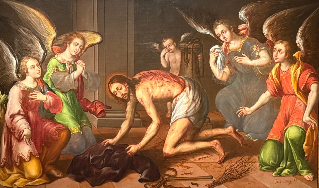 There are surely few more shocking artistic accounts of Christ’s flagellation than this image by the Mexican artist Juan Correa. Painted in the 1670s, Correa portrays Jesus on his hands and knees, pitifully reaching for his clothes after his bloody whipping at a column, the punishment handed down by Pontius Pilate as the usual prelude to crucifixion under Roman law.