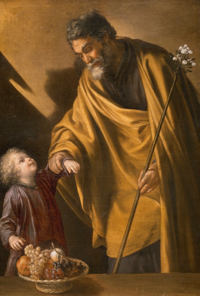In this image, by the seventeenth century artist Sebastián Martínez Domedel, Joseph is portrayed as a concerned father, grasping Jesus’s arm to prevent him from taking fruit from the basket. While this might appear to be a common paternal rebuke, in this instance Joseph’s action is loaded with meaning, given the sacrificial and Eucharistic significance of both the Child’s violet tunic and the grapes and pomegranates that predominate in the fruit basket. For as Christ’s earthly guardian how strong must have been Joseph’s instinct to protect the infant from future suffering?