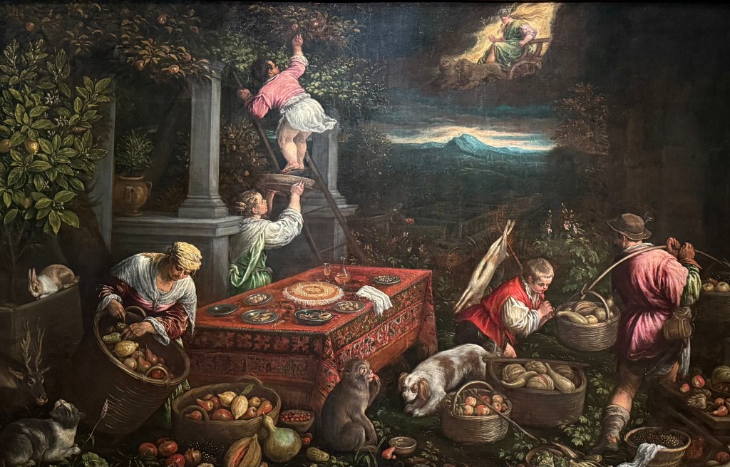In the l6th century, the world was believed to consist of four elements: Earth, Air, Fire, and Water. Here, Earth (associated with the season of autumn) is symbolized by the abundance of nature’s produce and by the small figure of Cybele, the ancient mother-goddess of earth and fertility, who rides across the sky in a chariot pulled by two lions.
