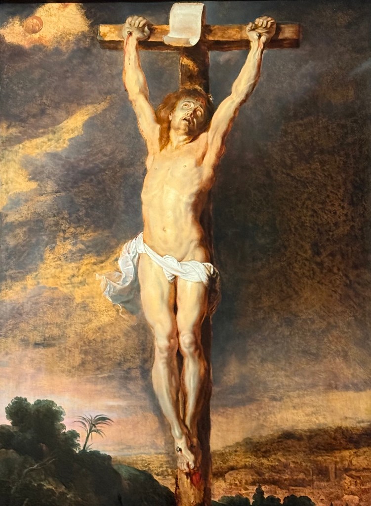 Conventional representations of the Crucifixion highlight Jesus’s suffering by showing an emaciated figure hanging limply with downcast eyes. However, in this image by the Flemish artist Peter Paul Rubens we see a radical departure from this tradition. Rather than a tortured martyr, this Christ is heroically alive. He raised his eyes trustingly toward the heavens. His muscular body, derived from ancient Roman sculpture, is brilliantly lit. Thus, the artist emphasises Jesus’s divinity, showing the faithful that his sacrifice will ensure their salvation.