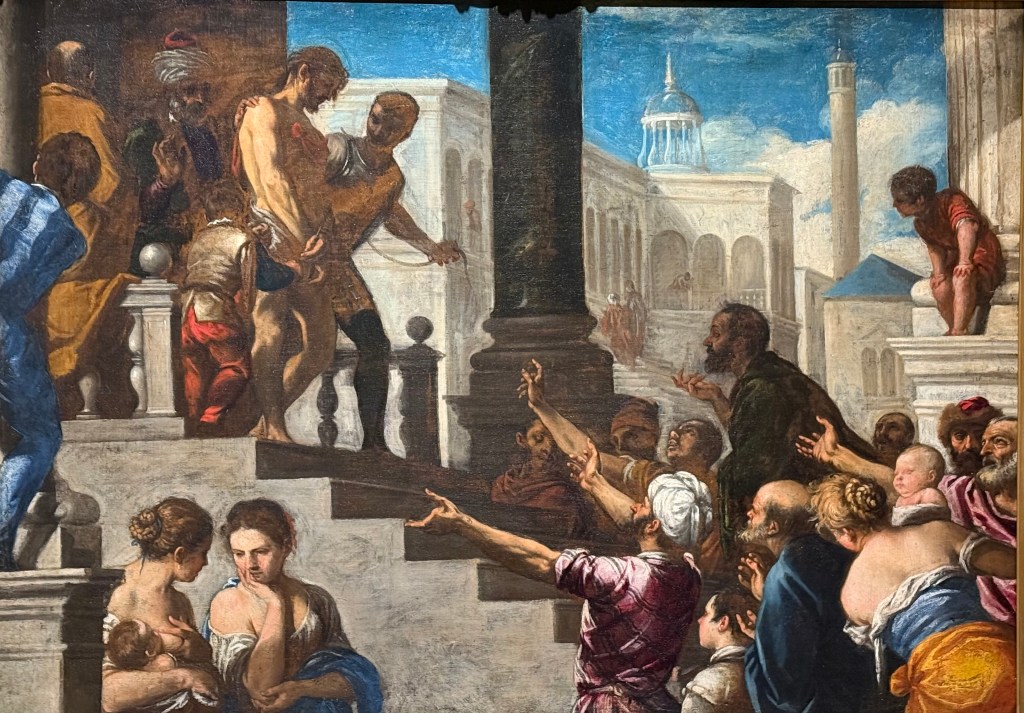 Christ stands at the top of the stairs and is mocked by a Roman soldier, while the Roman governor Pontius Pilate gestures to the crowd, declaring, “Look, I am bringing him out to you to let you know that I find no case against him” (John 19:4).
