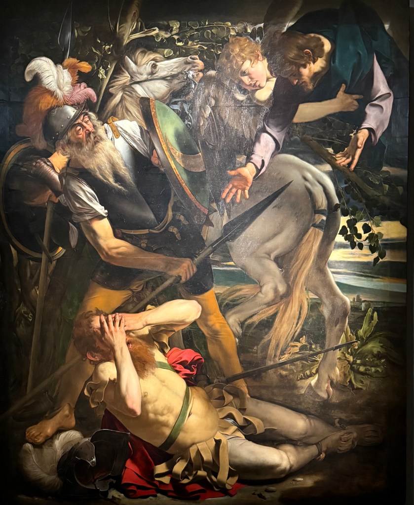 While many of the works are usually at home in Rome’s museums, the joy of this exhibition is seeing a number of works from private collections and US institutions, including this stunning image of the Conversion of Saint Paul (Saul) from the Nicoletta Odescalchi collection.