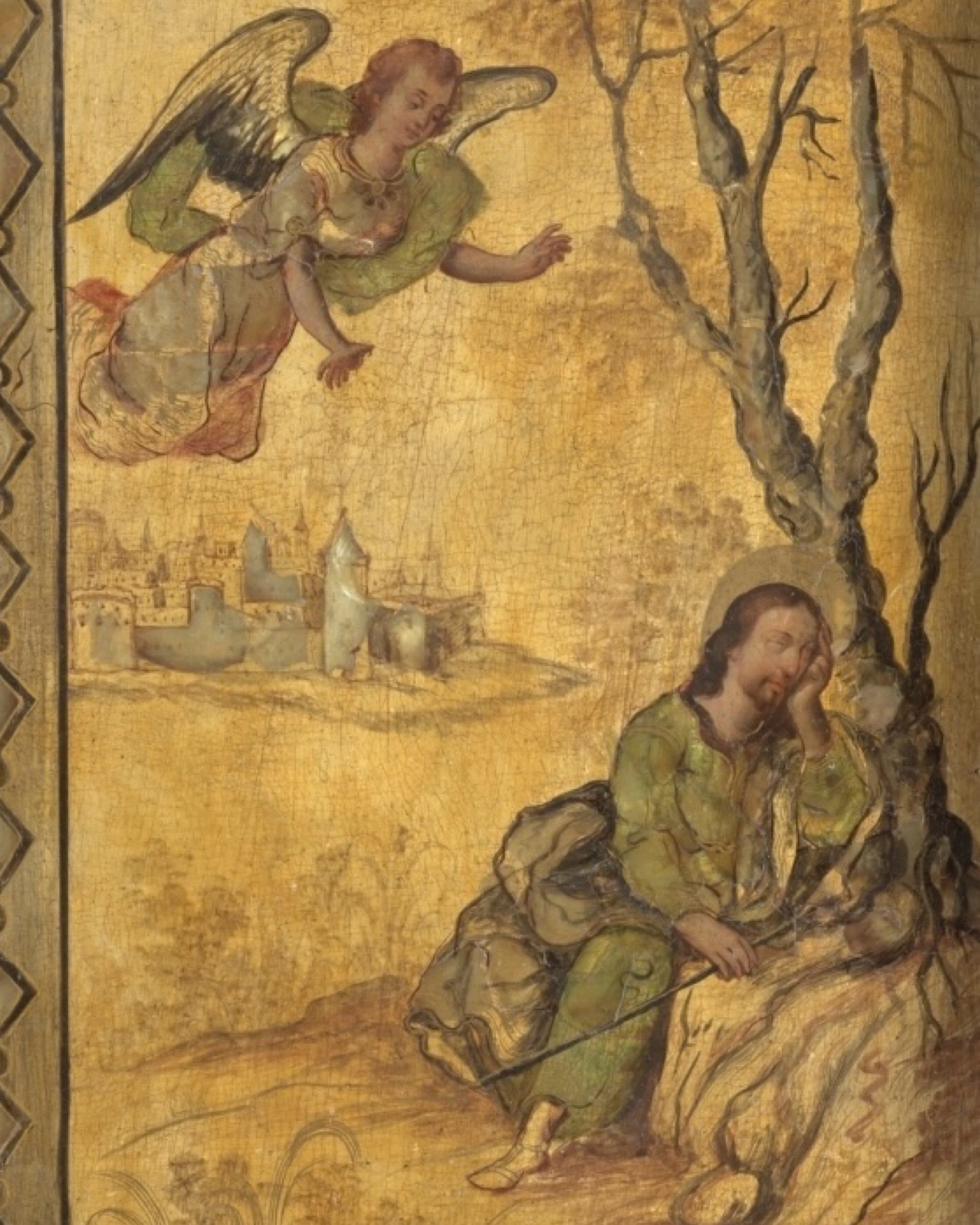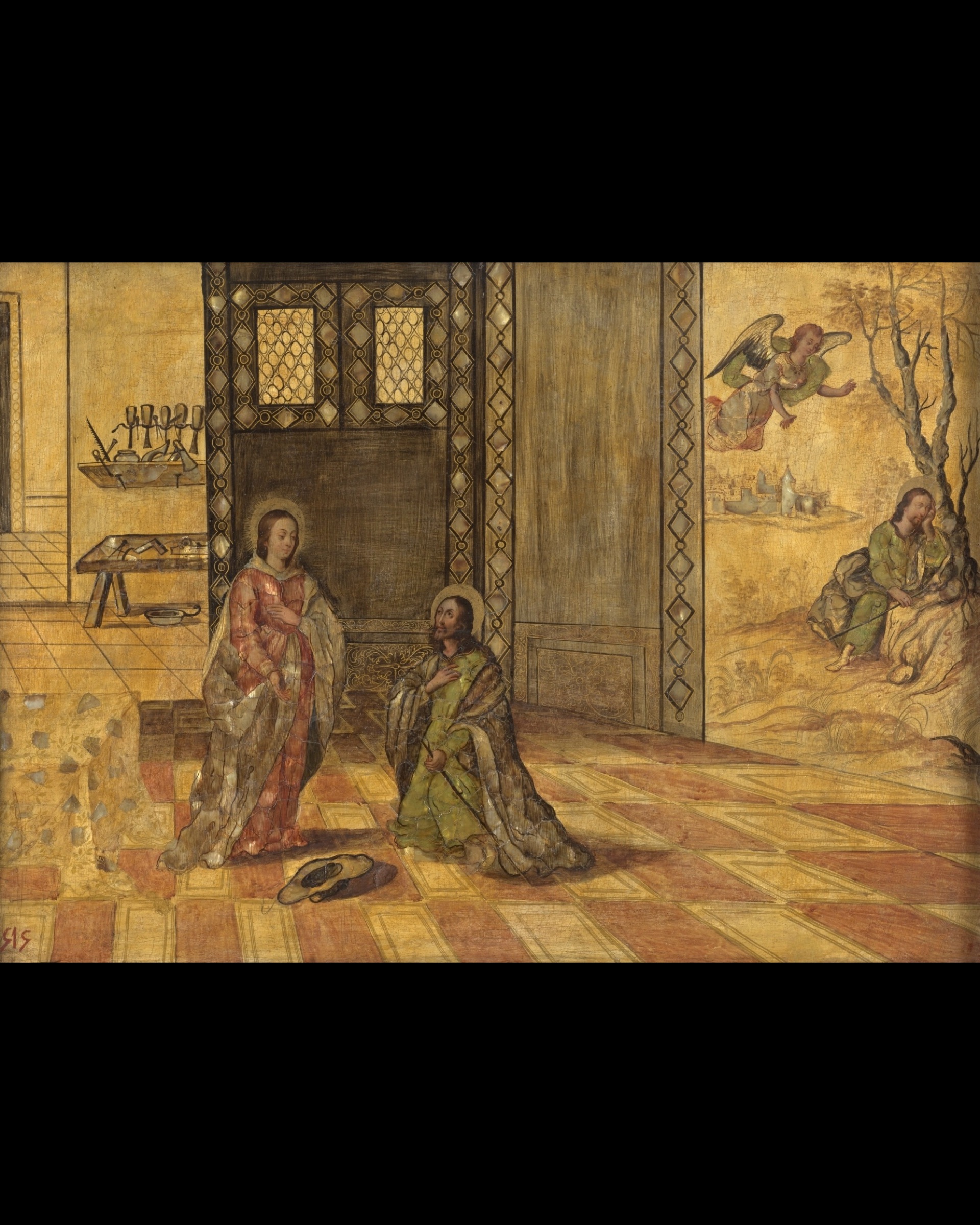 This 18th century image of Saint Joseph’s Dream and Repentance, made from shell and oil paint, comes from a series of six scenes dedicated to the Life of the Virgin. It recalls the episode from the opening chapter of Matthew’s gospel when Joseph discovered Mary was pregnant and considered sending her away, but ‘while he thought on these things, behold the angel of the Lord appeared to him in his sleep, saying: Joseph, son of David, fear not to take unto thee Mary thy wife, for that which is conceived in her, is of the Holy Ghost. And she shall bring forth a son: and thou shalt call his name JESUS. For he shall save his people from their sins’.