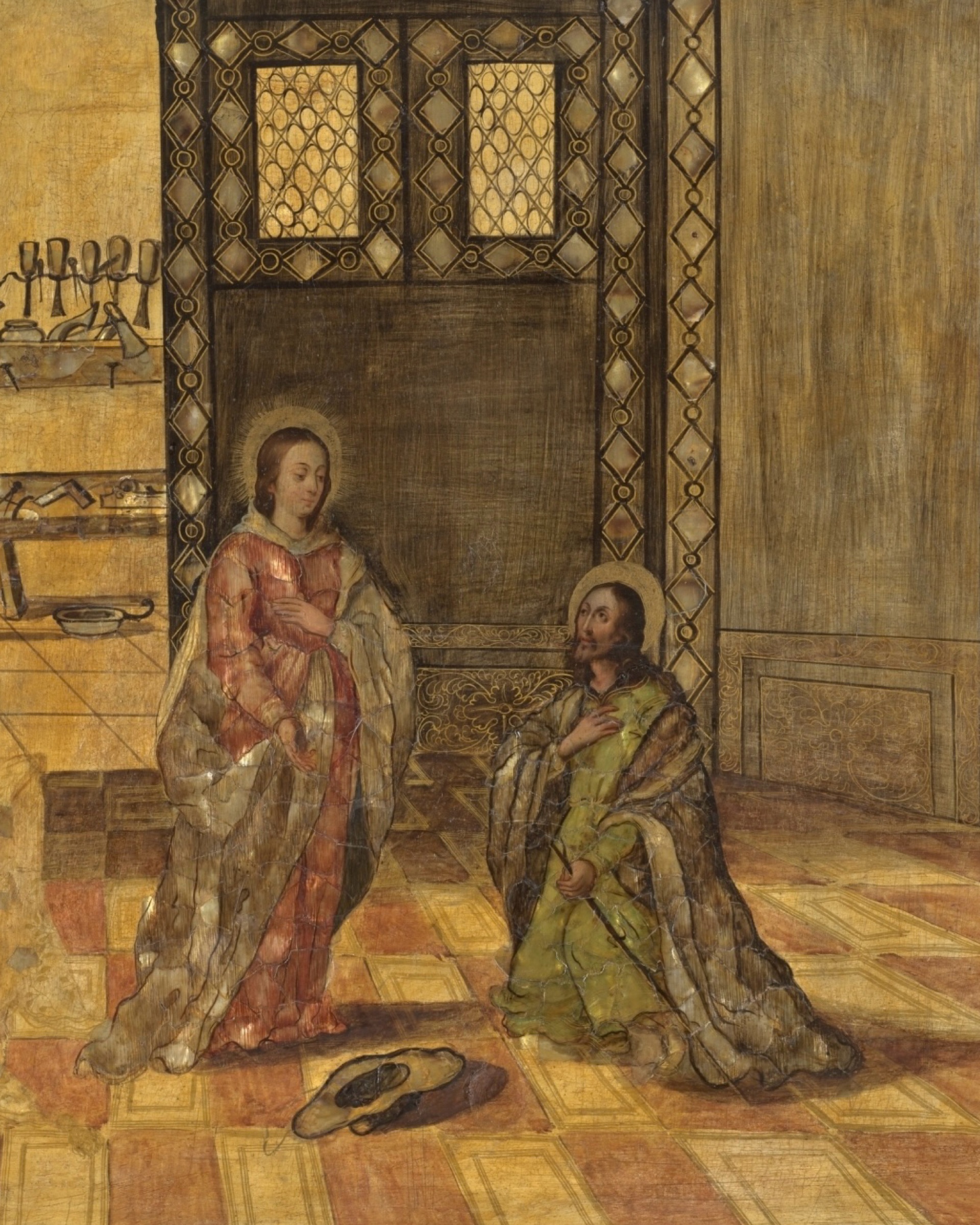 These panels called ‘enconchados’ were executed using a technique of Oriental origin, and were very popular in New Spanish culture, where local artists developed and espoused them as one of their distinctive products. Their characteristic gleam stems from a combination of inlaid sheets of mother-of-pearl and fine layers of oil paint.