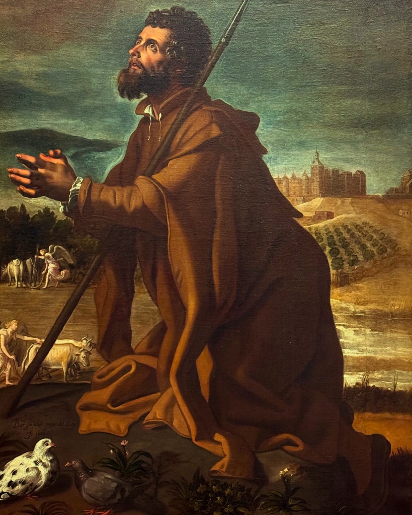 The 15th May is the Feast of San Isidro, the patron saint of Madrid. In this image by Bartolomé González we see the farmer -saint kneeling in prayer while angels have been sent to help him manage both his work and his prayer life.